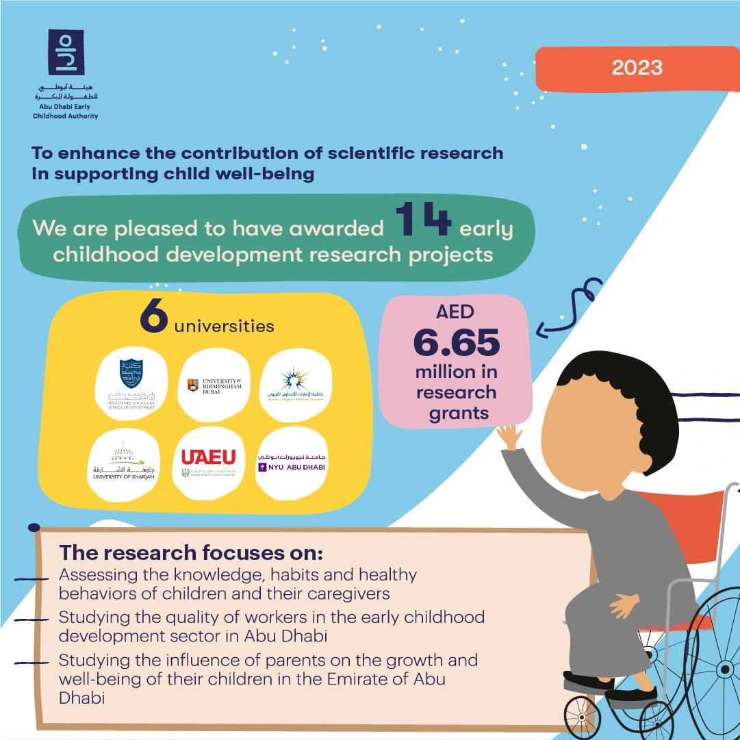 The Abu Dhabi Early Childhood Authority (ECA) has announced an investment of AED 6.65 million in 14 research grants aimed at enhancing early childhood development (ECD) in the Emirate of Abu Dhabi. These grants focus on producing actionable evidence which can inform ECD programs and policies throughout the Emirate of Abu Dhabi while advancing the science of ECD in a culturally relevant manner.